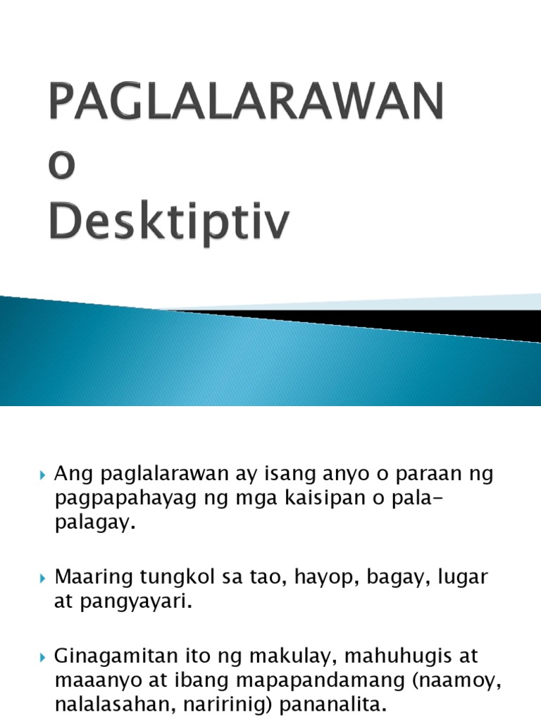 Nagbibigay ng impormasyong may kinalaman sa limang pandama ang tekstong deskriptibo. Ang anumang salitang ginagamit para sa pagpapakita ng pagmamahal ay mahalaga lalo na sa mga pagkakataong nag-uumpisa pa lamang ipakita ng isang tao ang kaniyang damdamin. 03-05-2002 SA pakikisalamuha ko sa mga taga-nayon ay marami akong narinig na mga salitang matalinghaga.