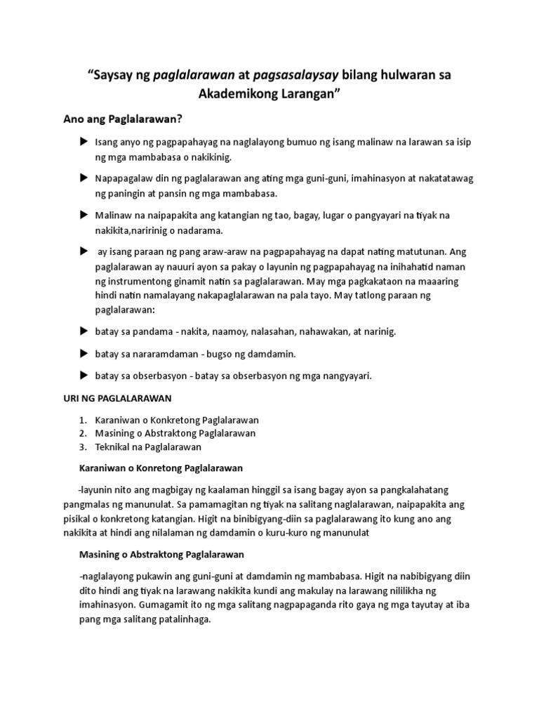 Sa karaniwang paglalarawan subhektibo ang paglalahad ng kongkretong katangiang inilalarawan. Ito ay bukang Bibig na hango sa karanasan ng tao at nagsisilbing patnubay sa dapat gawin sa buhay. MATALINGHAGANG PAHAYAG Ito ay ang mga ekspresyong may malalalim na salita o may hindi tiyak na kahulugan.