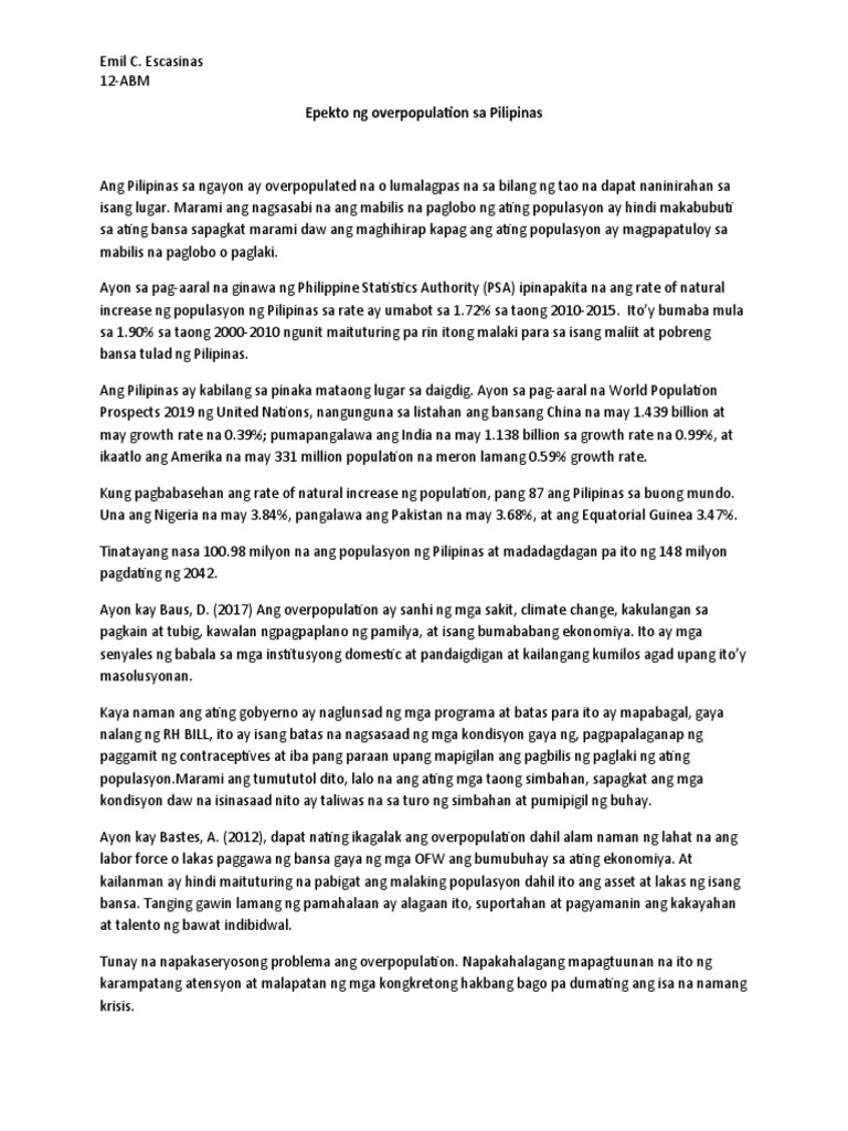 31-01-2011 Gamitin natin ang ginawa mong paghambing sa populasyon ng Pinas sa isang lobong mayroon ng hangin sa loob. Magkakaroon ng mga bagong kaibigan na pagkakatiwalaan ang mga tao dahil masaya mamuhay kung malaki ang iyong pamilyaAng masamang epekto ng paglaki ng populasyon ay kakulangan sa pagkain dahil mahirap na maghanap ng trabaho ngayon at kawalan ng tirahan dahil maraming kailangang gawin o bilhin na importanteng bagay ng mag-anak. Gayun pa man napakaraming mga talata sa Bibliya ang malinaw na nagpapakita kung ano ang pananaw ng Diyos tungkol sa aborsyon.