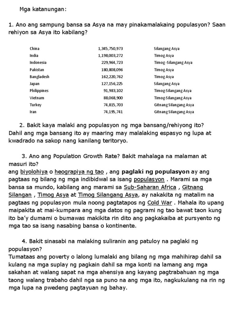 Higit ding tumitindi ang. Limang bansa sa Asya na may Pinakamaliit na Populasyon Maldives Brunei Bhutan Bahrain Timor-Leste Pagkatapos ay sagutan ang mga gabay na tanong sa ibaba. Sagot Malaking suliranin ang patuloy ng paglaki ng populasyon dahil sa mga sumusunod na dahilan.
